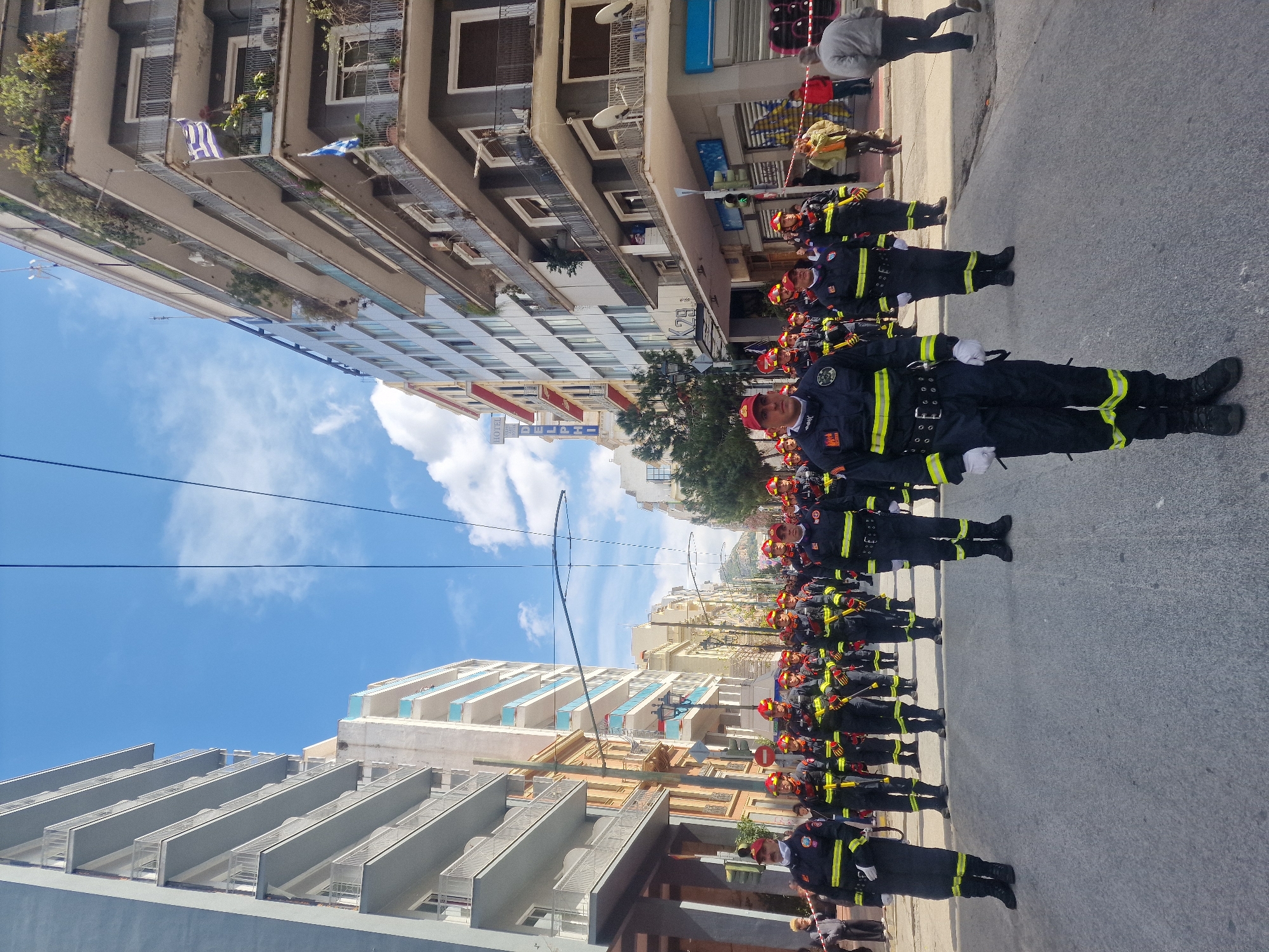 A daytime photograph captures a parade of uniformed personnel marching on a paved street in Athens, Greece