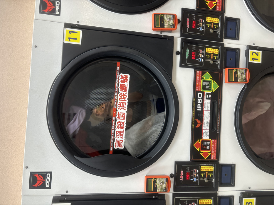 The image displays a section of a commercial laundromat in Kaohsiung, Taiwan, featuring several IPSO-branded industrial dryers