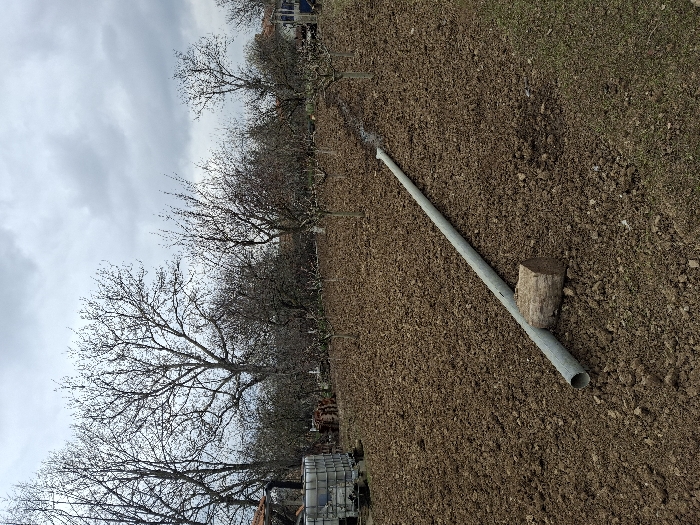 The scene depicts an orchard in Mokresh, Bulgaria, under a uniformly overcast grey sky. The foreground and mid-ground consist of tilled, dark brown earth, with a section of green grass visible in the lower right. A grey pipe, approximately 4-5 inches in diameter, lies diagonally across the tilled soil, extending from the lower left-center towards the upper right. A roughly cylindrical, light brown log segment, approximately 1 foot long, supports the pipe near its midpoint. A dark, linear accumulation of moisture is visible in the tilled earth beyond the upper right end of the pipe. Numerous bare deciduous trees, indicative of an orchard, populate the mid-ground and background, with larger, taller bare trees specifically on the left. A white Intermediate Bulk Container (IBC) tote, framed in metal, is partially visible on the far left. No people or active human interactions are present in the scene.