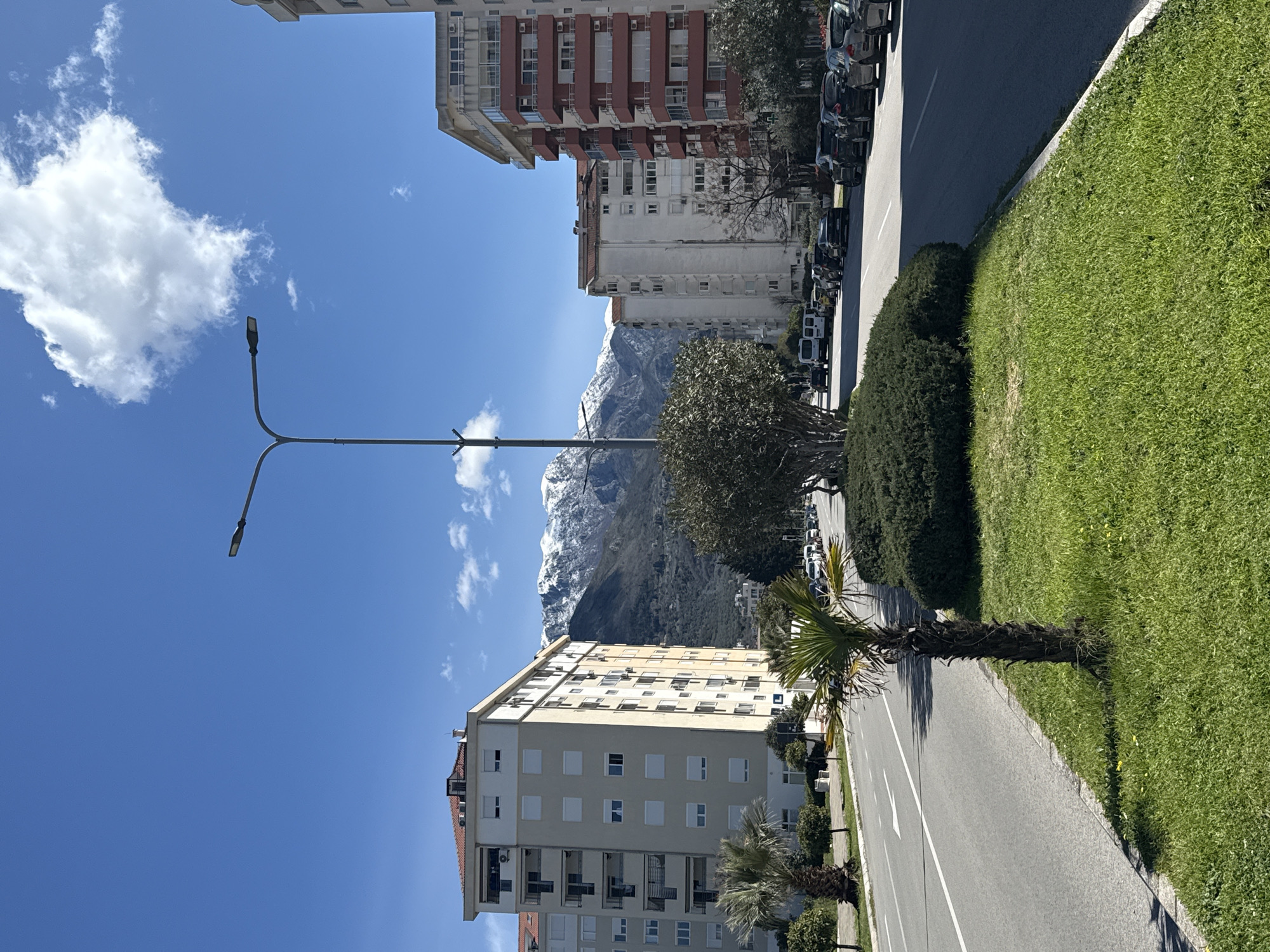 The image depicts a street scene in Bar, Montenegro, characterized by a mix of urban and natural elements. The street itself is lined with buildings of varying heights, some with white and red exteriors, indicating residential or commercial use. Palm trees and neatly trimmed bushes run along the sidewalk, suggesting a planned urban landscape. In the background, a mountain range with snow-capped peaks is visible, providing a scenic backdrop. A streetlight extends across the frame against a clear blue sky with scattered clouds. Cars are parked along the side of the road. There are no visible people in the image. The scene is bathed in daylight, suggesting a sunny day.