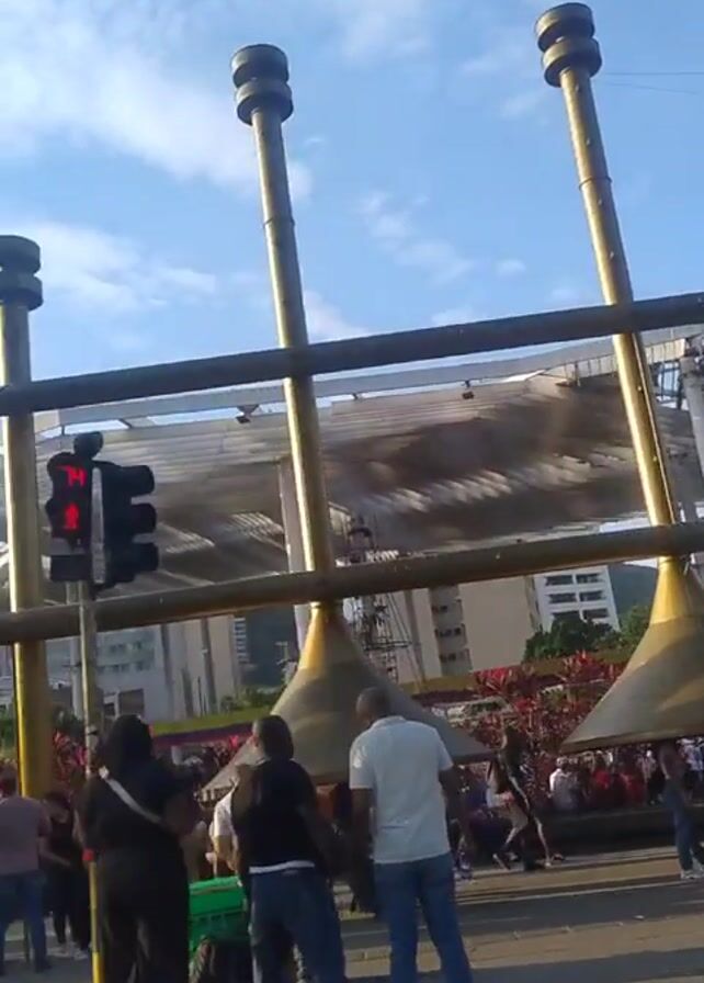 large crowd of people gathered in an outdoor space. In the foreground, there are two large, gold-colored structures resembling musical instruments, possibly tubas, with people standing beneath them. A street vendor with a blue cart and umbrella is selling items. There are trees and buildings in the background, and a large white structure with a transparent roof is visible behind the crowd. The sky is blue with scattered clouds. People are walking and talking, and there is general activity in the area. A traffic light shows "73" on its display.