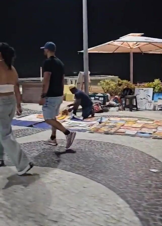. The video shows a night scene on what appears to be a promenade by a beach. The area is paved with a patterned stone design. Several individuals are visible, walking and standing near a display of artwork or textiles spread out on the pavement. Some of the displayed items feature the colors of the Brazilian flag. In the background, the beach can be seen with a few scattered objects, possibly trash cans or other containers. The sky is dark, indicating it is nighttime. There are also some parasols and a few lights illuminating the area.