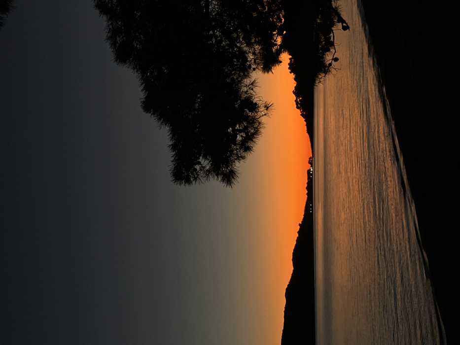 A landscape photograph depicts a sunset over the coastline of Rafailovići, Montenegro. The upper sky is a dark, desaturated gray, transitioning horizontally into a vibrant orange-red band near the horizon. This band extends across the width of the image. A calm body of water occupies the middle ground, reflecting the orange hues of the sky with subtle ripples on its surface. Dark, silhouetted landforms, consistent with mountains or hills, are visible on both the left and right sides of the distant horizon. Approximately five distinct, small points of artificial light are visible on a distant landmass near the center-right horizon. In the foreground, a substantial portion of a dark, silhouetted coniferous tree branch, featuring visible needles and cones, extends into the frame from the upper right, partially obscuring the sky and water. A narrow strip of dark shoreline, likely sandy or rocky, is present along the bottom edge of the image, where it meets the water. No human figures, animals, or specific actions are discernible within the frame.