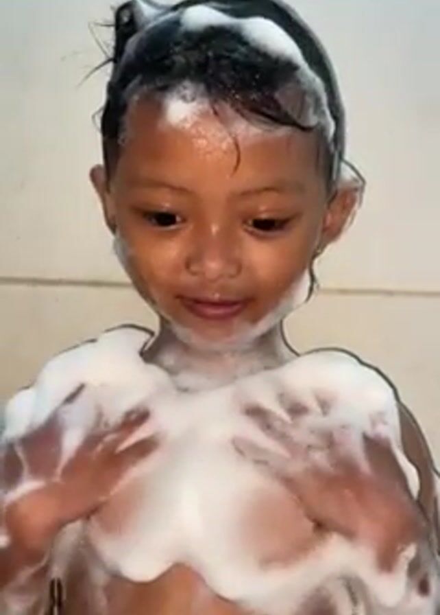 A young child is taking a shower. The child, who appears to be female with dark hair pulled back in a small bun, is covered in white soap suds. The child is smiling and looking at the camera in the beginning and is looking down after while putting soap in a square in the palms of both hands. The background shows a simple, white-tiled bathroom wall. The video seems to have been taken with a handheld device.