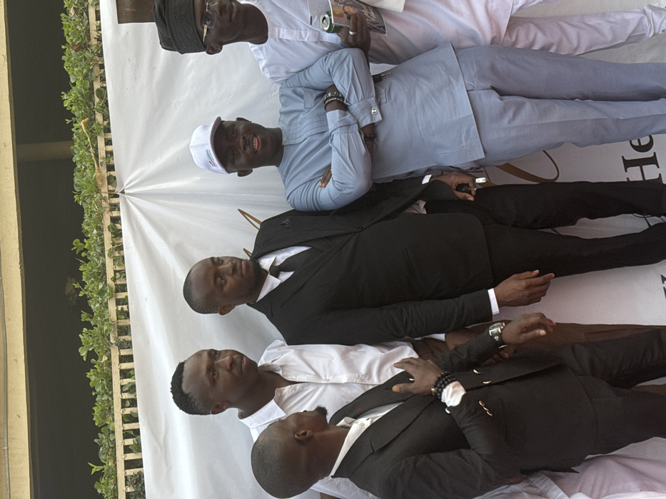 The image depicts six adult males gathered outdoors in what appears to be an event setting in Jos, Nigeria. They are standing in front of a white fabric banner, partially obscuring a building structure with green foliage above it. The banner displays faint dark lettering, including "He" at the bottom right. From left to right: 1. A male, mostly obscured, with a white traditional garment visible. 2. A male with short dark hair and a beard, wearing a black suit jacket with gold buttons, a white shirt, and black trousers. He has a black beaded bracelet on his left wrist and a watch on his right. His right hand is placed on his chest, and he is looking towards the third male. 3. A male with short dark hair, wearing a white long-sleeved collared shirt and brown trousers. He is looking to his right. 4. A male with short dark hair, wearing a black suit jacket, black tie, white shirt, and black trousers. He is looking to his right. 5. A male with a dark complexion, wearing a light blue traditional tunic with matching trousers and a white baseball cap. He has his arms crossed over his chest, a watch on his left wrist, and multiple bracelets on his right. He is smiling and looking forward. 6. A male, partially visible on the far right, wearing a white traditional tunic, matching trousers, a black cap, and glasses. He holds a silver beverage can and a magazine or flyer in his left hand. He is looking to his left. The group appears to be posing or interacting, with several individuals looking in different directions, while the fifth male is directly engaging the camera with a smile. The scene is illuminated by natural light.