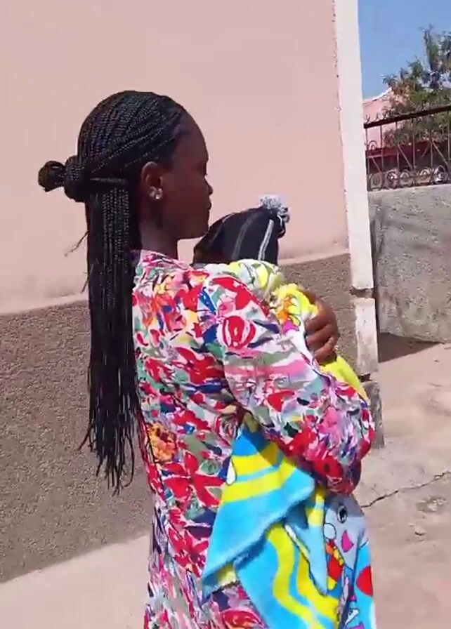 A woman with long black braids holds a baby in her arms. She is wearing a colorful floral long-sleeved shirt. The baby is wearing a black and white striped beanie and is wrapped in a yellow and blue patterned blanket. The woman walks slowly, looking at the baby, and adjusts its hat. They are outside, walking on a paved surface in front of a light-colored wall. The sky is clear and blue.