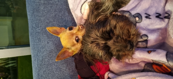 A tan Chihuahua peers up at the camera with its large ears perked up. Next to it, a dark, shaggy dog with matted fur rests on a patterned blanket with "ZZZ" designs. Both dogs appear to be sitting on a person's lap, wearing blue jeans. A window with a green object reflecting off the glass is visible in the background.