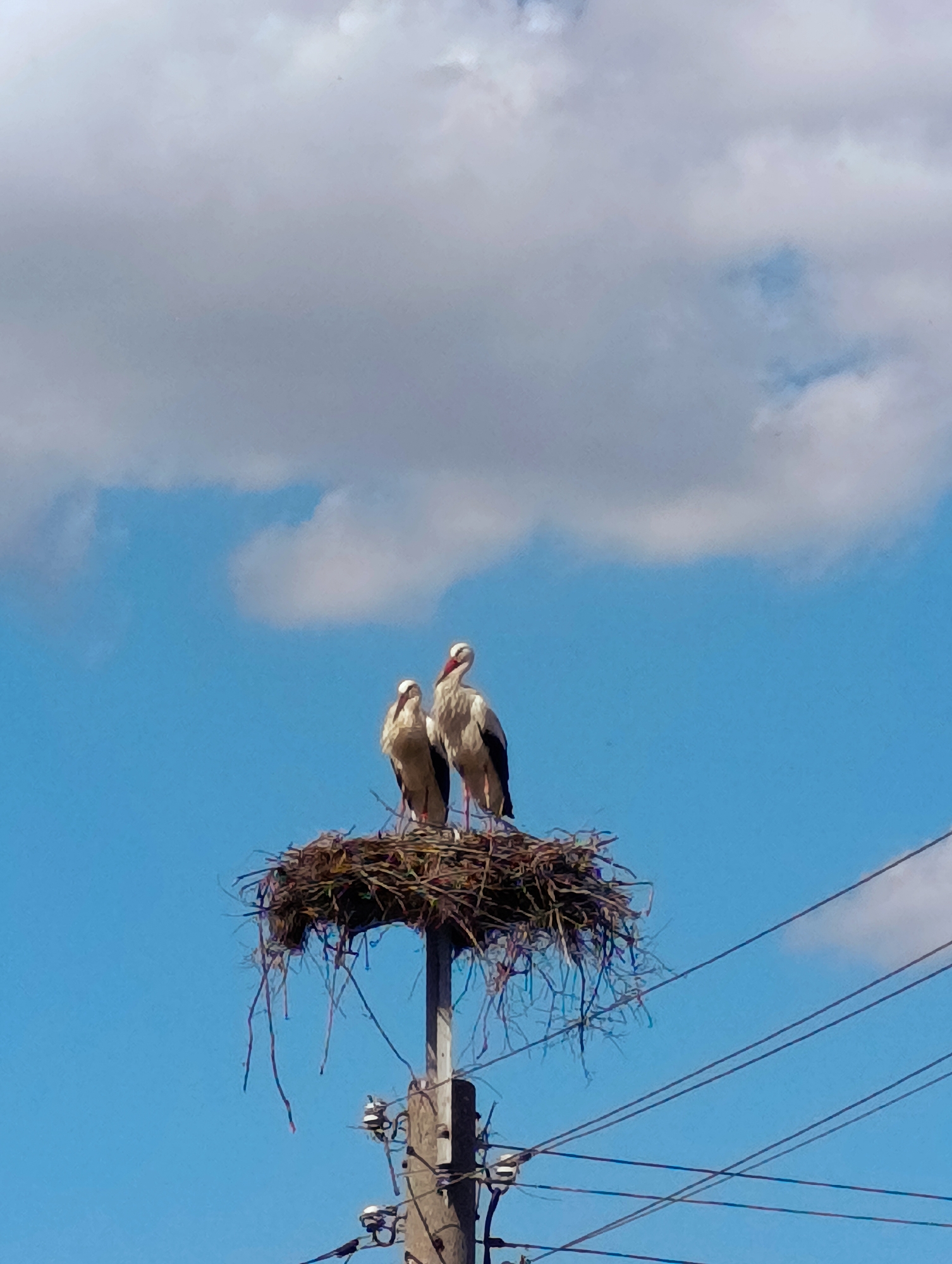 - "Two white storks with black wing tips and red beaks stand in a large nest of sticks on top of a utility pole in Shiroko pole, Bulgaria" by FM-OgnH32, licensed under CC BY 4.0