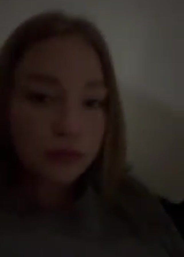 A young woman with light hair and a gray sweatshirt is filmed in what appears to be a dimly lit room