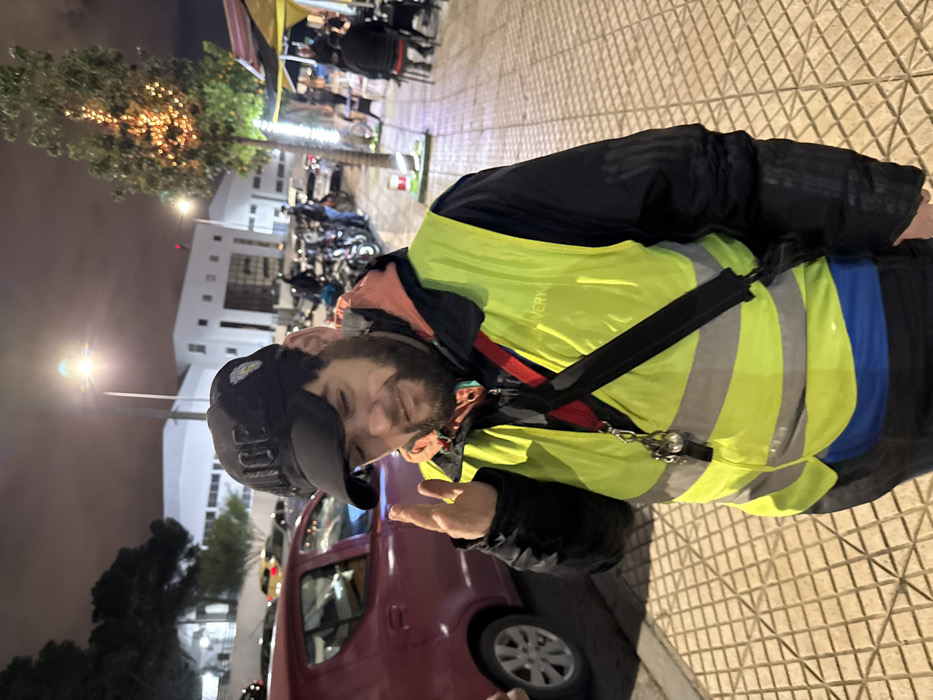 A man wearing a bright yellow safety vest and a black baseball cap stands near a red car on a paved sidewalk. A black strap crosses his body. He appears to be talking or gesturing with his hand. In the background, a building with a few lights, trees, motorcycles, and possibly a few people are visible. The scene is lit by streetlights.