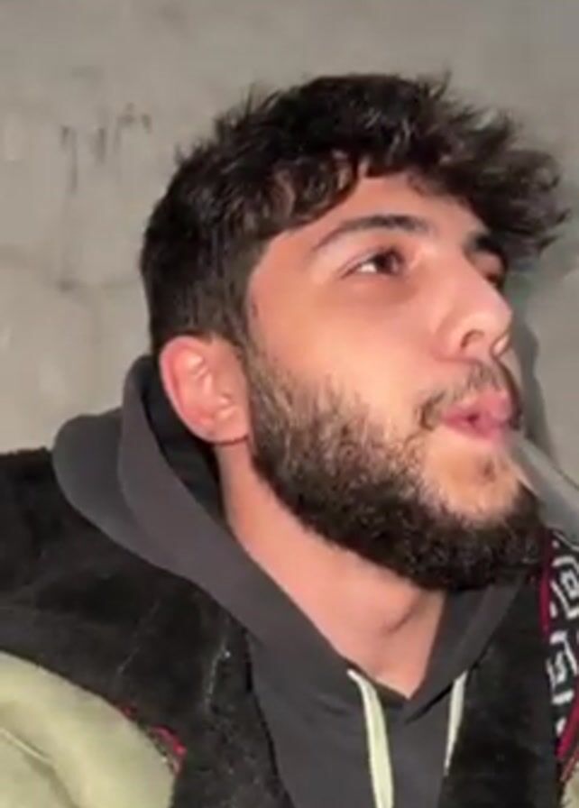 A young man with dark curly hair and a beard exhales a large cloud of smoke. He is wearing a black hoodie under a green jacket with decorative trim. The background is a plain light gray wall. The camera angle is low, looking upwards at the man.