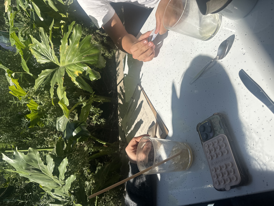 A white speckled table surface is bathed in sunlight, hosting a nearly empty glass with a straw, a phone with a grip case, a spoon, and a knife. Two people are partially visible, one holding a glass, the other's hands resting on the table. A menu card lies flat. Lush green foliage, including broad leaves, dominates the left side. Shadow patterns from the foliage add depth to the scene.