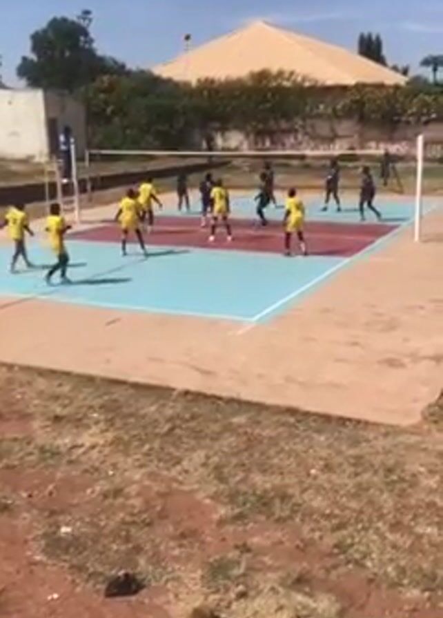 volleyball game taking place outdoors on a court with a light blue and red playing surface. There are several players on each side of the net, some wearing yellow jerseys and others in darker, possibly navy, jerseys. They are actively playing the game, passing and hitting the volleyball. The court is surrounded by a dirt and grass area. In the background, there is a large building with a distinctive light brown roof, along with some trees and other buildings. A person is sitting in a high chair officiating. The weather appears to be sunny.