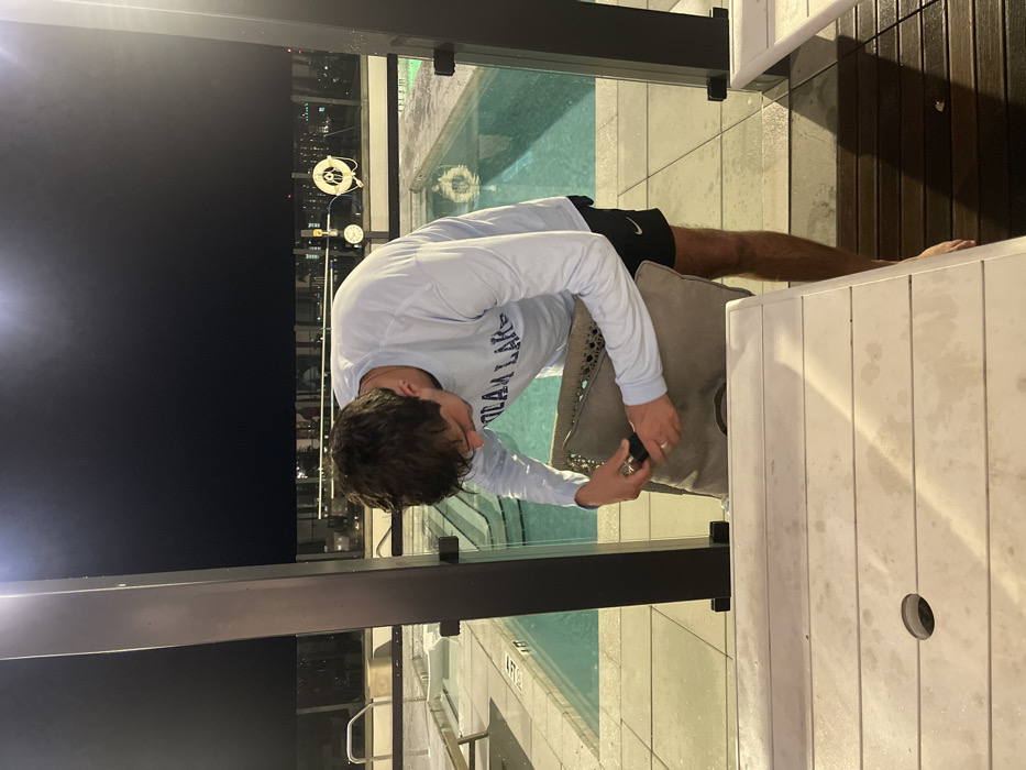 This image depicts an elevated pool deck at night in Gainesville, United States