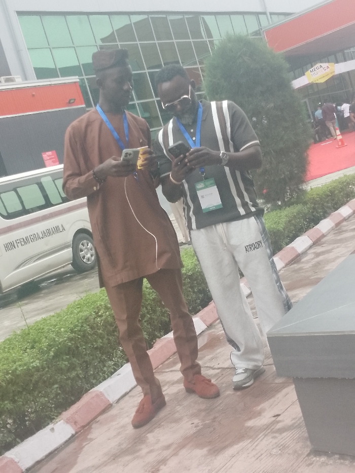 Two adult males are observed standing outdoors in Alaguntan, Nigeria, engaged with their smartphones
