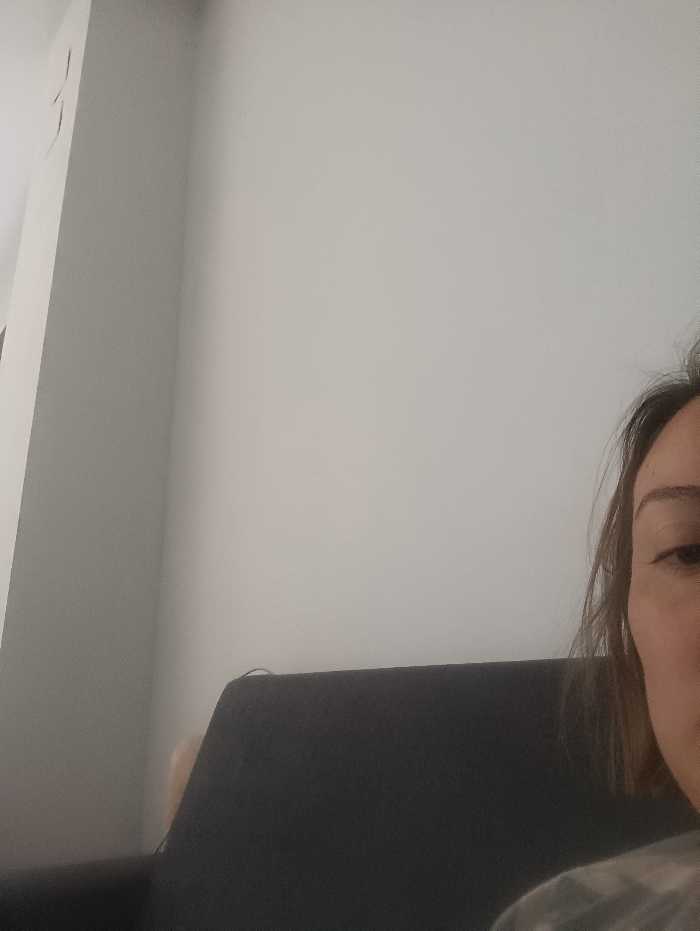 This image captures a fragmented indoor scene, purportedly located in Sagunto, Spain. The right side of an individual's face, including the eye, portions of the cheek and mouth, and the right shoulder, is visible on the far right. The individual has dark brown hair that partially covers the face. They appear to be seated or reclining, with a dark-colored, possibly fabric, furniture item (likely a sofa or chair back) occupying the lower half of the frame. The background consists of plain, light-colored walls. A vertical corner where two walls meet is discernible in the upper-left quadrant, with a faint, dark, curved mark present on the left wall near this corner. The lighting appears even, suggesting an interior light source. No specific actions or interactions are clearly depicted.