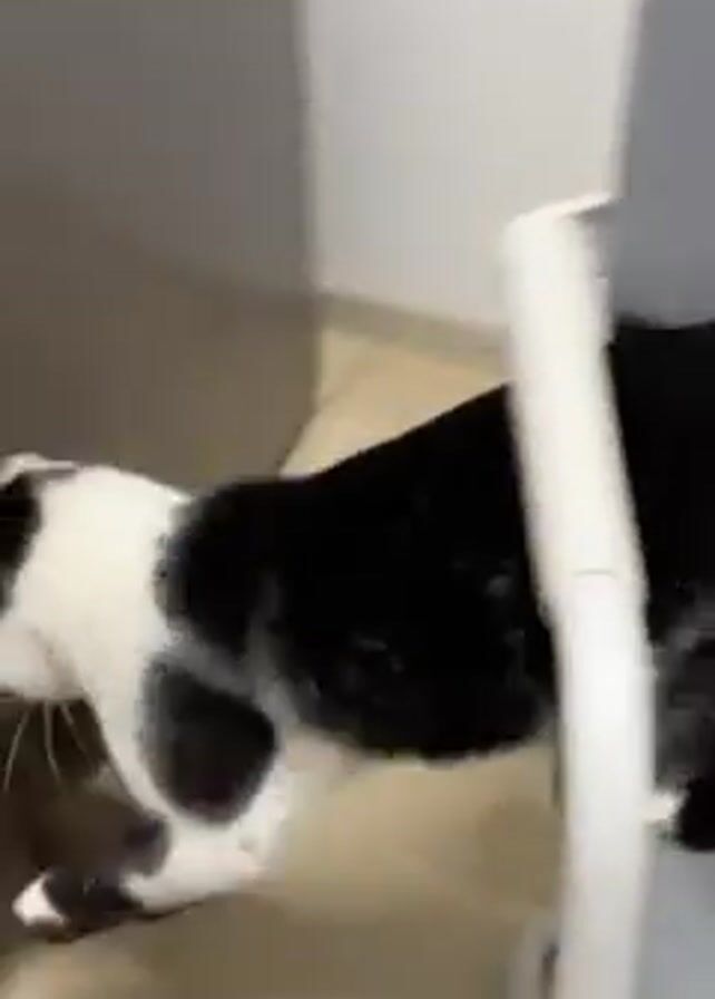A brief video shows two cats in an indoor environment. First, a black and white cat jumps off of a small table. It approaches a second cat, which has dark gray and tan mottled fur. The cats interact briefly and then the first cat walks away. The other cat stays in place near a refrigerator and a chair. The floor is tiled.
