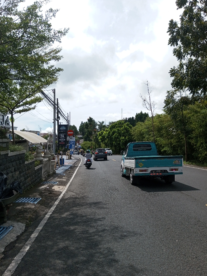 The image depicts a roadside scene in the city of Taohom, Laos, under an overcast sky with scattered white and grey clouds. A paved asphalt road, marked by a solid white line on its right edge, accommodates vehicular traffic moving away from the viewer. In the right foreground, a teal and white pickup truck, bearing license plate "3688 JD" (partially visible), is observed transporting a bare tree sapling vertically in its bed. Behind it, a motorcycle carries two individuals, both wearing light-colored helmets and attire. Further down the road, a dark SUV and a white car are visible in the same lane, followed by additional indistinct vehicles. The right side of the road is bordered by dense green foliage. On the left side of the road, an uneven shoulder with multiple rectangular metal drain grates precedes a dark grey stone wall topped with lighter caps. Several light-colored, ornate decorative pillars or statues are positioned along the wall. Beyond these, a building facade with a partially visible sign displaying "JA" and a white awning is present. A prominent utility pole with numerous black electrical wires extends upwards, featuring attached signs including a red "No Entry" symbol and a dark rectangular sign with text partially legible as "KILLARNEY 187". A large leafy tree partially frames the upper left quadrant of the scene. Tree shadows are cast upon the asphalt in the foreground.