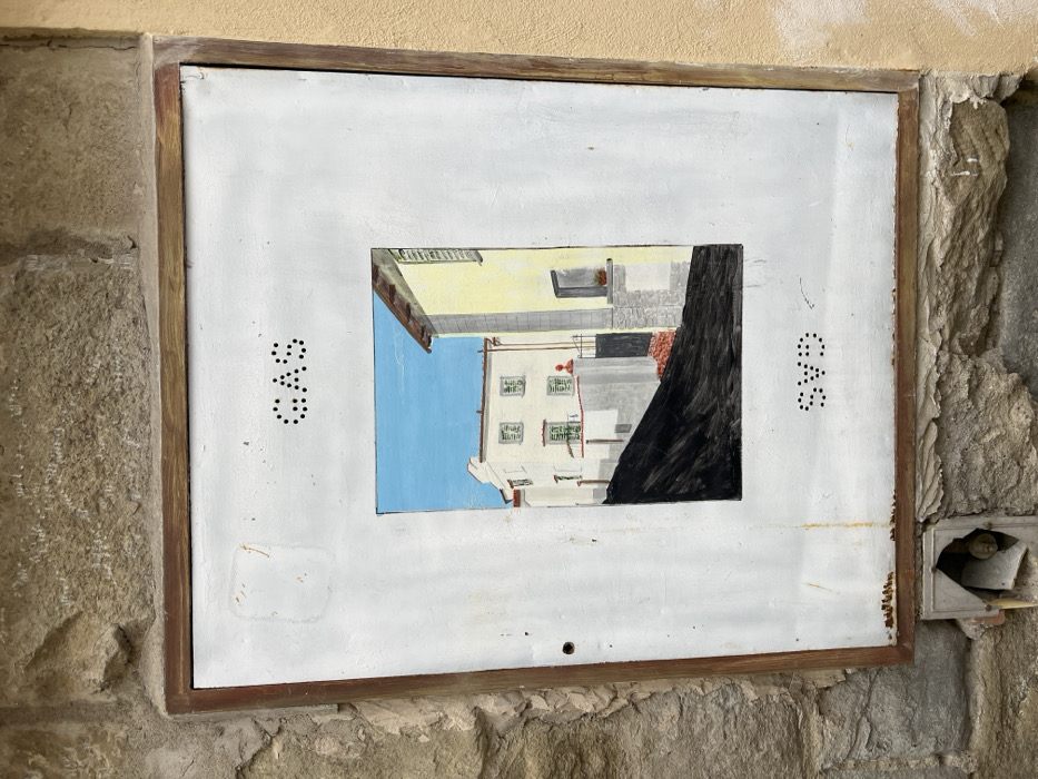 A white, rectangular metal utility access panel, framed by worn reddish-brown trim, is recessed into a building wall in Fiesole, Italy