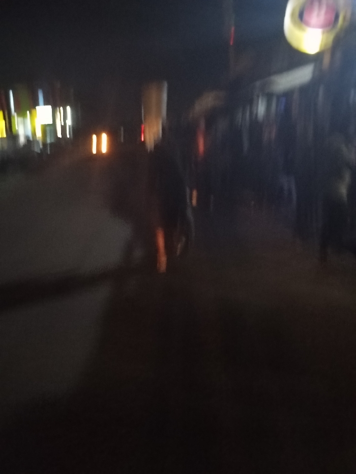 The image depicts a blurry, low-light nocturnal urban street scene in the city of Unknown, Unknown. A dark, paved road occupies the foreground and midground. A prominent, elongated shadow extends diagonally from the upper left across the road surface. A central, blurred human figure, silhouetted in dark clothing with lighter lower legs or footwear, is positioned in the midground, facing away from the viewer and casting the shadow. Two distinct, vertical orange light sources, consistent with vehicle taillights, are visible in the distant midground. To the left, multiple blurred, vertical rectangular and square light sources, predominantly yellow and white, indicate illuminated distant structures. On the right, a blurred group of indistinct individuals occupies what appears to be a sidewalk or storefront area. Above this group, a partially visible, illuminated circular sign with yellow and red elements suggests a commercial establishment. The environment is an active streetscape under artificial illumination at night.