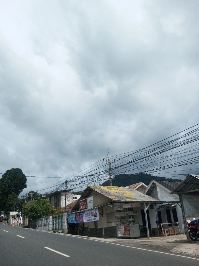 A street view beneath a cloudy sky features buildings, wires, and vegetation. A road runs alongside the buildings, one of which appears to be a small shop with advertisements. A mountain ridge is visible in the distance, partially obscured by the wires. A tree stands to the left of the buildings. The scene suggests a rural or suburban environment.