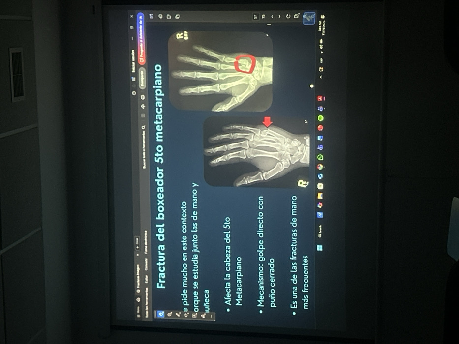 The image depicts an indoor scene, likely a lecture hall or classroom, at a facility presumed to be in Interlomas, Mexico. A large, dark projection screen dominates the view, displaying a medical presentation. The screen shows the title "Fractura del boxeador 5to metacarpiano" (Boxer's Fracture 5th Metacarpal) in teal text. Below the title, several bullet points in Spanish describe the condition: it is frequently studied with hand and wrist injuries, affects the head of the 5th metacarpal, results from a direct blow with a closed fist, and is a common hand fracture. Two X-ray images of a human hand are central to the presentation. The left X-ray, an anterior-posterior view of a right hand (marked with an "R"), features a red arrow pointing towards the base of the 5th metacarpal. The right X-ray, likely an oblique view of a right hand, shows a distinct fracture at the distal end of the 5th metacarpal, highlighted by a red circular annotation. The presentation interface, visible on the screen, includes a browser-like tab bar at the top and a Windows taskbar at the bottom. The taskbar displays various application icons, the current date "11/16/2023," and the time "8:33 AM." The overhead environment is partially visible above the screen, revealing a white acoustic tile ceiling with a grid pattern, recessed lighting fixtures, and an HVAC vent. The room is dimly lit, consistent with a projected presentation setting. No individuals are visible in the frame.