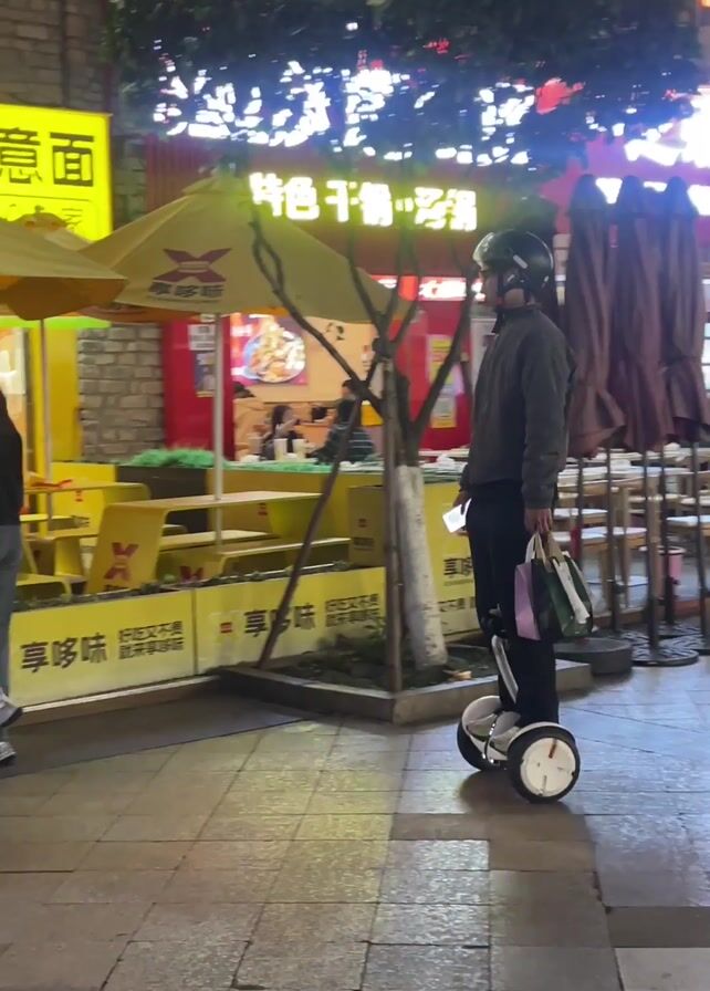 man riding a hoverboard on a paved walkway. The man is wearing a helmet, dark pants, and a grey jacket. He is carrying shopping bags in one hand. He is riding past outdoor seating areas of a restaurant or food court. A woman walks in the opposite direction past the man. There is a tree or bush near the outdoor seating with neon lights. The environment suggests an indoor market or mall.