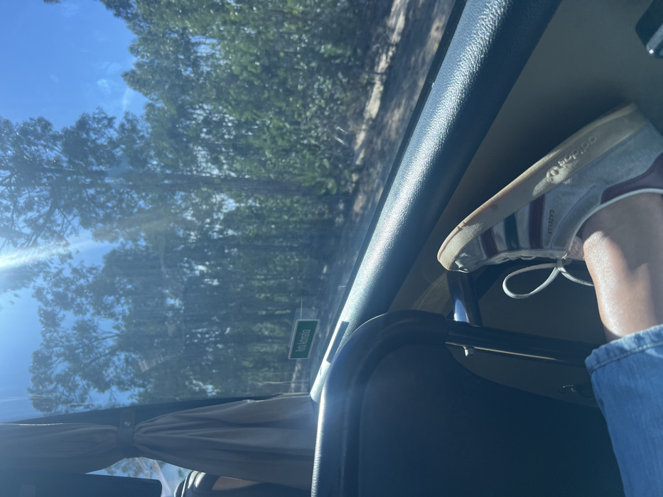 The image depicts a forensic view from inside a vehicle on a bright, sunny day, looking outwards through a window towards a dense wooded area. In the foreground, positioned in the lower right, a person's leg, clad in blue denim jeans, is visible. Their left foot, wearing a white, burgundy, and green Adidas Gazelle sneaker with the "Adidas" logo discernible on the sole, is propped against a dark-colored interior window ledge or armrest. The vehicle's interior features include a dark seatback on the left and a beige curtain tied back on the window frame. Through the window, a thick expanse of tall trees with green foliage dominates the midground and background, suggesting a forest or woodland environment. A light-colored dirt or gravel path is partially visible at the base of the trees. The sky above the tree line is clear and bright blue, with notable sun glare or lens flare originating from the upper left quadrant, indicating direct sunlight. A small, rectangular green sign with white text, reading "Porta Automática" (Portuguese for "Automatic Door"), is affixed to the window pane. This sign, common on public transport in Portugal, combined with the natural environment, places the scene in or near the city of Aveiro, Portugal. The vehicle is either stationary or in transit.