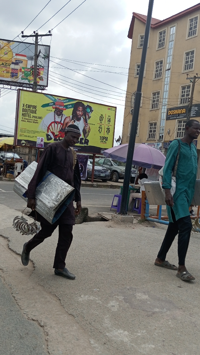 Two men are walking on a street in front of a yellow advertisement for X-Empire Boutique Hotel. The man on the left carries a stack of metal containers and a wreath-like object. The man on the right has a bag on his shoulder. Behind them are parked cars, a vendor with an umbrella, and a multi-story building. Above, an advertisement for "LAZIZ" is mounted on a utility pole. The sky is overcast.