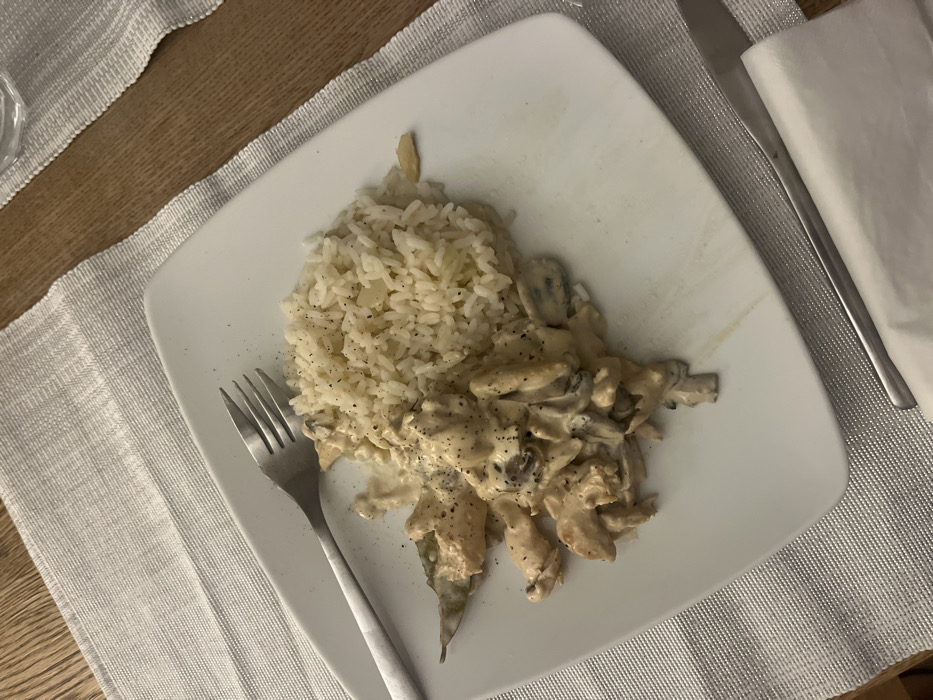A white square plate holds a serving of white rice, slightly seasoned with black pepper. Next to the rice is a creamy mushroom and chicken sauce, also seasoned with pepper. A fork rests on the plate, near the rice and sauce. A white napkin and a knife are positioned on the right side of the plate. The plate sits on a gray patterned placemat, with a wooden table visible in the background.