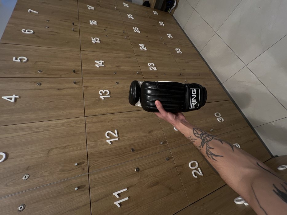 The image captures an indoor changing room or locker room facility in Boreti, Montenegro. A human forearm and hand, exhibiting visible tattoos including a dark, intricate design on the inner forearm, holds a single black "RING" brand MMA-style glove. The glove, featuring segmented padding, is oriented vertically, with the "RING" logo visible on the wrist strap. The background consists of multiple rows of light wood-grain lockers, each equipped with a circular silver lock mechanism and a white, raised number (e.g., 4, 5, 6, 7, 11, 12, 13, 14, 15, 16, 17, 20, 23, 24, 25, 26, 27, 30, 33, 34, 35). The floor is composed of light-grey square tiles with visible grout lines. A partial view of a dark shelf and a pair of dark athletic shoes is visible on the far right.