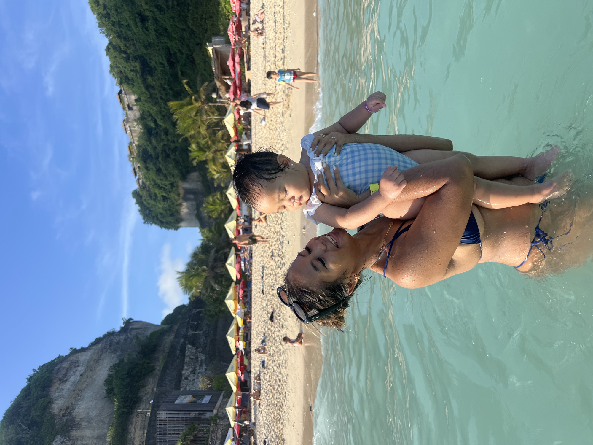 On a sunny day in Ungasan, Indonesia, a woman is standing in turquoise water holding a baby