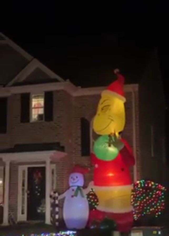 A two-story brick house with black shutters and Christmas decorations stands against a black night sky. In the yard are colorful Christmas lights, two trash bins, and two inflatable Christmas characters, a Grinch and a snowman. The Grinch is tall, wears a Santa hat and suit, and holds a green sack. The snowman is shorter and wears a red hat and scarf, and holds a candy cane. The front door of the house is decorated with a wreath. A window on the second floor is lit, and a figure can be seen in the window.