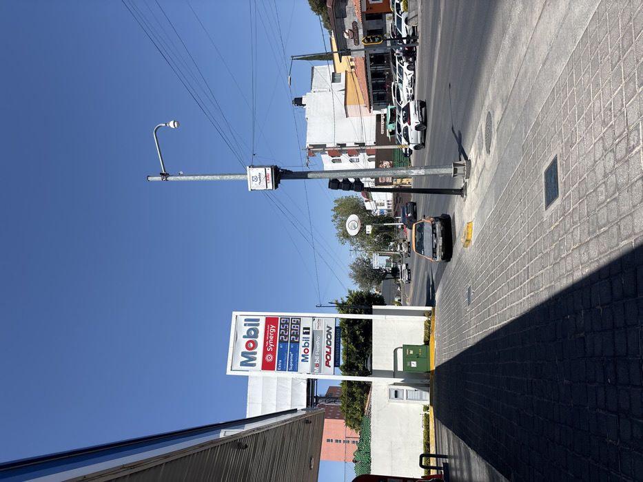 The scene depicts an outdoor urban environment under a clear blue sky, likely during daylight hours. The vantage point is from beneath the canopy of a Mobil gas station, looking out towards a multi-lane street in Puebla, Mexico. In the immediate foreground, the left side is dominated by a dark shadow cast by the gas station canopy, covering a section of gray, square-patterned pavers. A white wall, a green utility box, and a small door are visible behind the shadow. Midground elements include a prominent Mobil gas station sign, displaying "Synergy" fuel prices for "Extra" at 22.59 and "Supreme" at 23.89, along with "Mobil 1," "Mobil FleetPro," and a "POLICON" identifier. Adjacent to the gas station property, a light-colored sidewalk runs parallel to the street. A tall, light-grey metal utility pole stands at the edge of the sidewalk, equipped with a white box bearing a "Puebla" logo and "DDB," a spherical surveillance camera facing the street, and a black traffic light fixture. An orange, heavily damaged vehicle, appearing to be an older model sedan with its front bumper and grille missing, is parked on the shoulder facing away from the camera. Yellow painted curbs delineate the road from the sidewalk. The background features a multi-lane asphalt road with vehicles in motion and parked. A white SUV is visible in the rightmost lane, while other cars are parked in a lot associated with buildings further down the street. Various buildings of different architectural styles and colors line the street, including a reddish-brown structure on the left and a building with outdoor seating areas on the right. Trees and foliage are interspersed among the buildings. Overhead, utility wires crisscross the sky. No individuals are clearly discernible or performing specific actions in the immediate vicinity or as focal points.