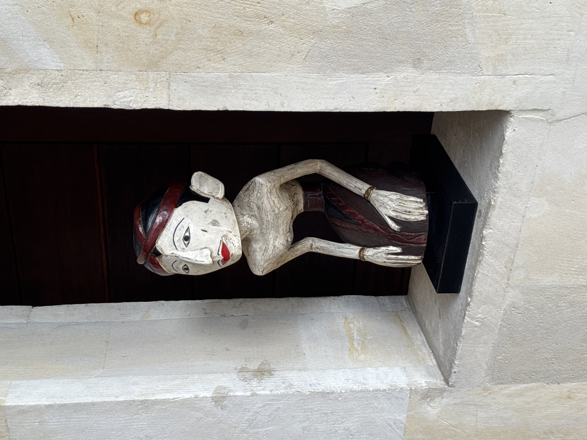 A wooden sculpture of a man, possibly a traditional Balinese figure, is situated in an opening within a light-colored, stuccoed or stone structure. The sculpture is painted with a white face, red lips, and black and red headdress, and it is wearing dark clothing. A black, rectangular box-like element is directly behind the figure. The location is Sayan, Indonesia.