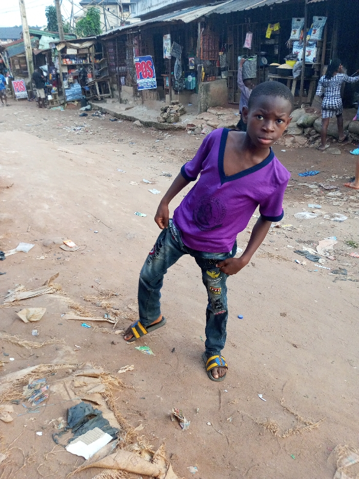 - "A young male, approximately 8-12 years old, stands centered in the foreground of an unpaved street in Onitsha, Nigeria" by FM-1O94j1, licensed under CC BY 4.0