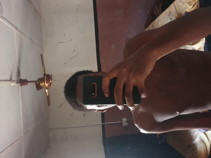 A male individual, shirtless and dark-skinned, is depicted in an indoor selfie