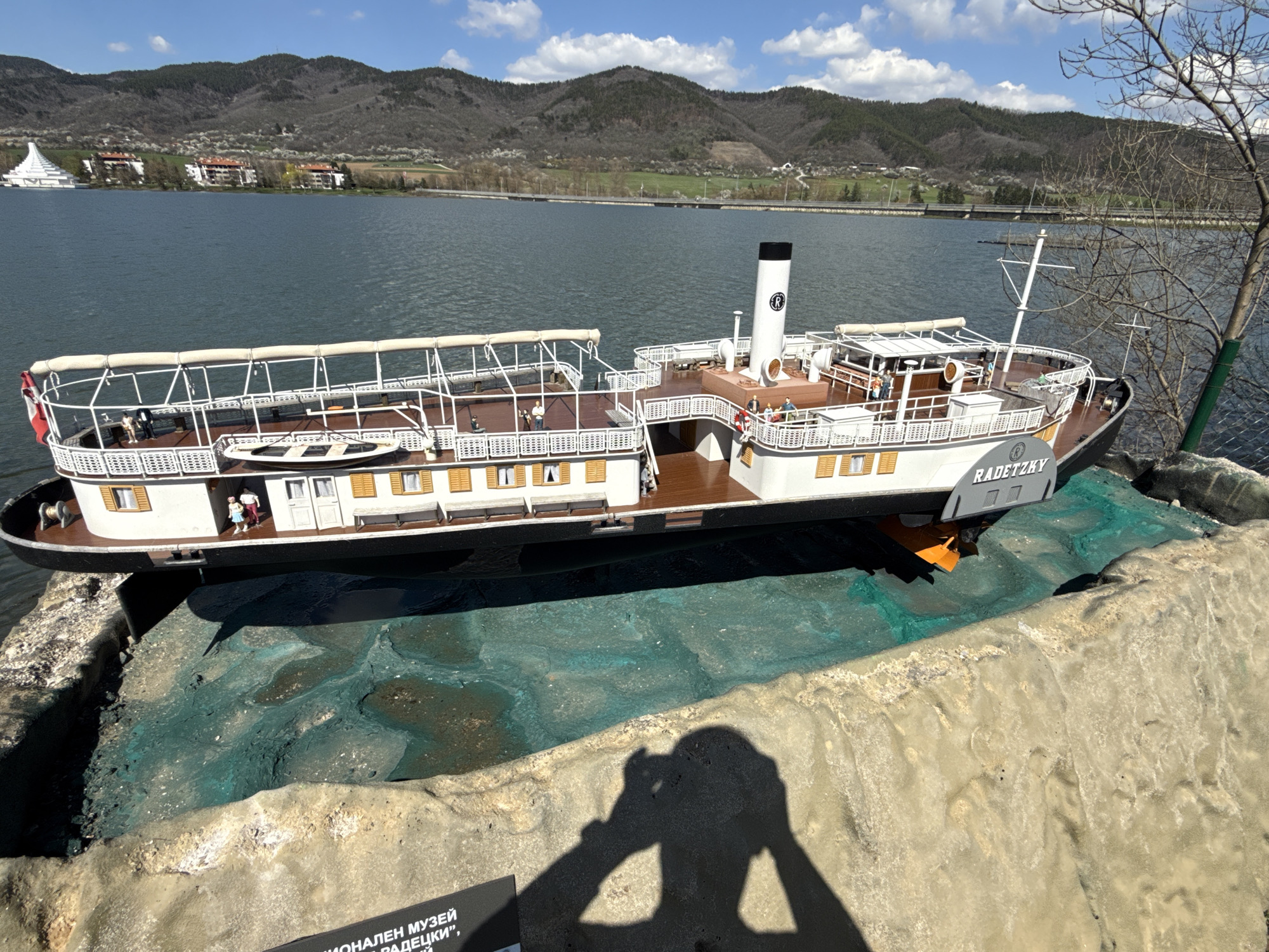 The image captures a detailed model of the "Radetzky" ship, situated on an artificial display that simulates water and rocky terrain. The ship is primarily white with black accents, featuring multiple levels, windows, a prominent smokestack, and the ship's name clearly visible on its stern. Small figures are present on the deck, suggesting a sense of scale and history. In the background, a tranquil lake stretches towards a landscape of rolling hills and mountains, partially obscured by scattered clouds in a bright blue sky. A bridge can be seen spanning across the lake. Based on the information in the bottom left corner of the image, the model is part of an exhibit at the National Museum of "Radetzky," likely located in Pravets, Bulgaria, which is near the lake depicted in the background. A tree branch extends into the frame on the right, adding a natural element to the manufactured scene. The shadow of a person taking the photo is visible in the foreground.