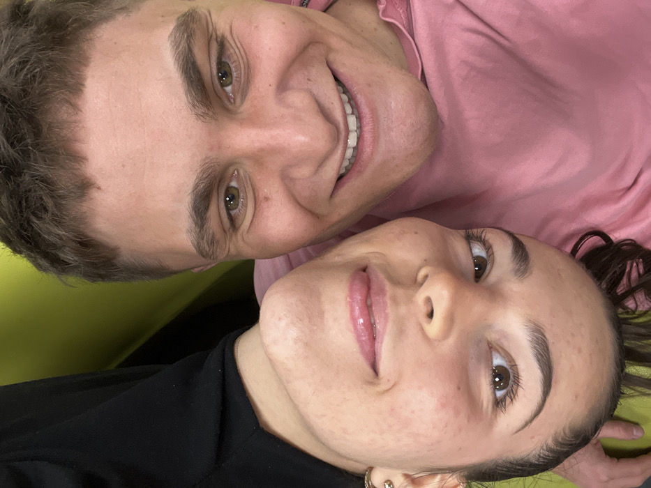 A close-up portrait depicts two individuals in an indoor setting in Dragoman, Bulgaria. The image is composed with a male subject on the right, oriented upright, smiling broadly at the camera with visible upper teeth. He has short, light brown hair and light brown eyes, wearing a pink crew-neck garment. To his left, and inverted relative to the male subject, a female subject's face is visible. She has dark brown hair, dark brown eyes, and a subtle smile with closed, glossy lips. A gold-colored hoop earring is present in her left ear. She wears a black garment. The background consists of a uniform lime green surface.