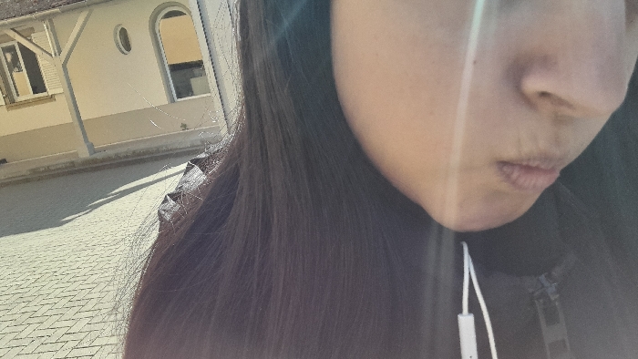 The image depicts a close-up, angled view of an individual outdoors, obscuring much of the scene. The subject's right lower face is visible in the upper right quadrant, showing the chin, slightly pursed lips, and the lower portion of the nose. Long, dark hair covers the majority of the left side of the frame, extending from the upper left to the lower right. A white earphone cable descends from beneath the subject's chin. The individual wears a dark garment with a visible zipper on the right side. The background reveals a light-colored building featuring a rectangular window with white shutters partially open, supported by an external white wooden beam structure. To its right, an oval window and a larger arched window are visible. The ground is paved with light-colored interlocking bricks arranged in a herringbone pattern, exhibiting long shadows consistent with direct sunlight. A lens flare is present in the upper right portion of the image. The general architecture suggests a European residential or commercial area. Based solely on the visual information, the precise location within Strasbourg, France, cannot be forensically determined beyond the presence of generic architectural elements.