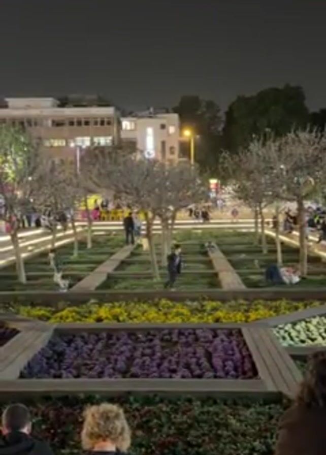 At night, a well-lit park is shown from a slightly elevated perspective. There are flower beds of purple, yellow, and green in the foreground, sectioned off by wooden rectangles. Beyond them, several small trees are arranged in a grid pattern, with lighted paths in between. People are walking, standing, or lying down within the grid. Buildings are visible in the background, with streetlights illuminating the area. People are sitting on the edge of the flower beds in the lower right foreground.