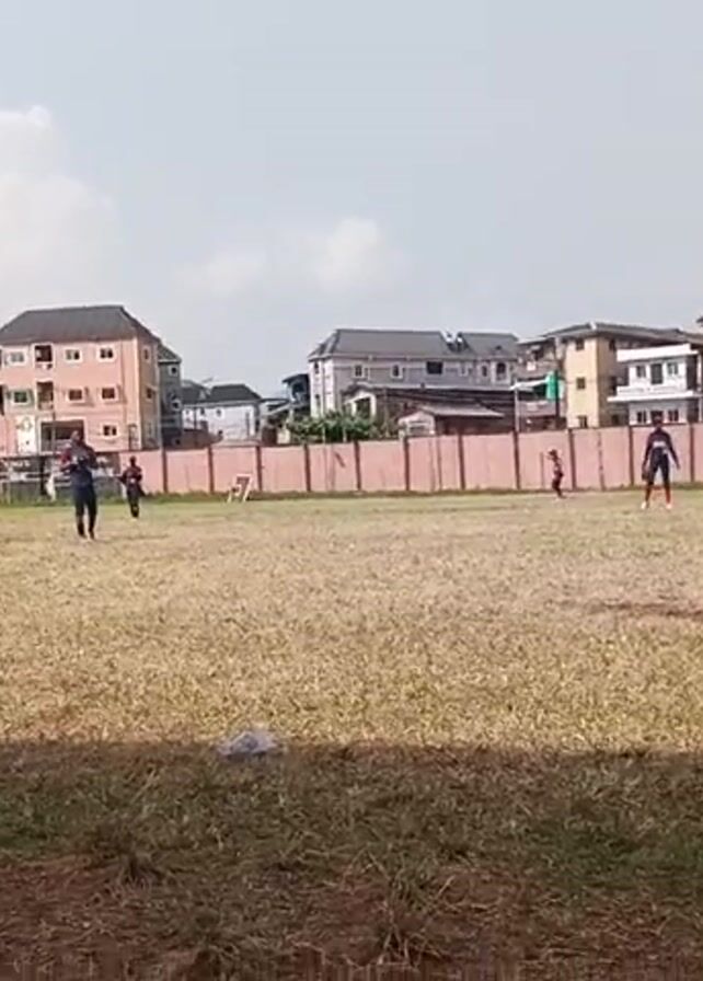 The scene captures a baseball game in progress on a grassy field surrounded by a low, pinkish wall. Buildings are visible in the background, and a cell tower stands to the right of the frame. Several individuals are scattered across the field, participating in the game. A batter wearing a purple shirt and white pants is at the plate, holding a bat over his head in preparation to swing. The catcher, dressed in red, white, and black protective gear with the number 03 on the back, is in a crouched position behind the batter. Other players are positioned in the field, including one dressed in white near the center and another wearing a dark shirt, walking on the left side of the frame. The grass is dry and uneven, and the sky is partly cloudy.
