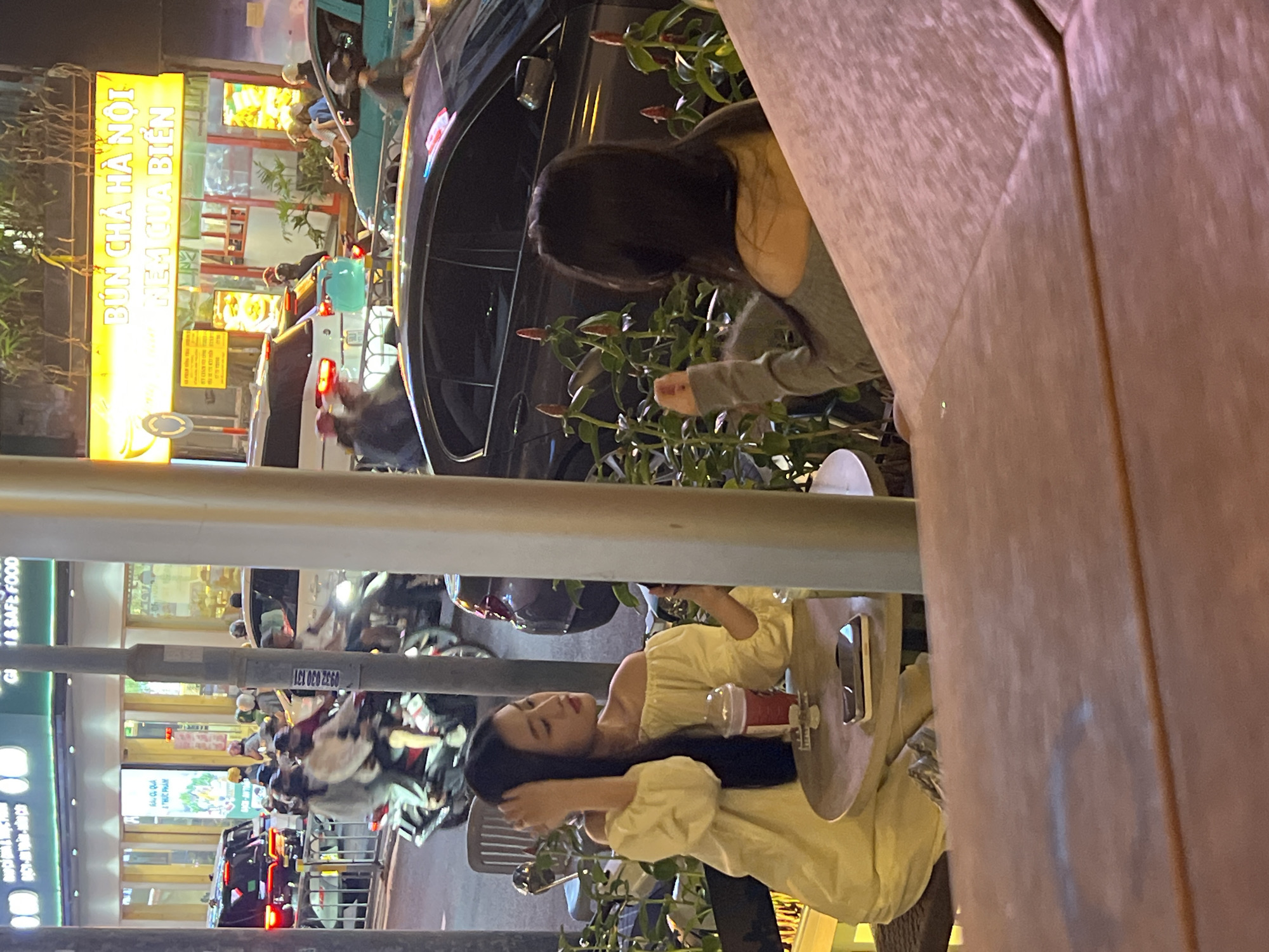 The image presents a nighttime outdoor scene in Thủ Đức, Vietnam, capturing a café setting adjacent to a busy street. In the foreground, two individuals are seated at a round outdoor table. The woman on the left, with long dark hair, wears a light yellow off-the-shoulder top. Her right hand is raised, touching her hair near her head, while her left arm rests on the table. A red plastic cup with a white lid and a straw, alongside a white smartphone with a dark case, are visible on the table in front of her. The second individual, partially obscured and seated with her back to the viewer, has long dark hair and wears a grey off-the-shoulder top. Her right hand is raised, with fingers slightly curled, possibly making a gesture or holding a small, obscured object. A light-colored vertical pole stands between the two individuals. Behind them, lush green foliage with reddish-tipped plants is visible, and beyond this vegetation, a dark-colored sedan is parked or moving slowly. The background reveals a bustling urban street illuminated by artificial light. Multiple motorbikes with riders, some wearing helmets, and several cars (including a white SUV and a teal sedan) are in motion. Vehicle headlights and taillights are active. Across the street, brightly lit commercial buildings display illuminated signage. A prominent yellow sign reads "BÚN CHẢ HÀ NỘI" and "NEM CUA BIỂN," identifying a Vietnamese food establishment. Another building features a green sign with partially visible white text, including "SAFE FOOD."