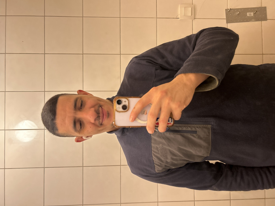 A male individual is depicted in a full-frame selfie, captured in an interior room in Schiltigheim, France