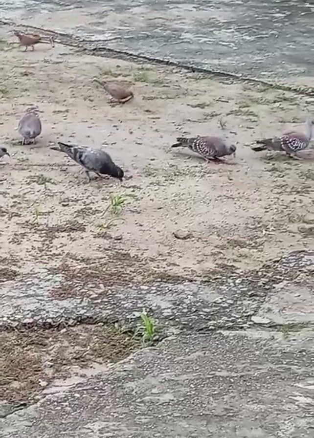 The scene captures a gathering of pigeons in what appears to be a yard or outdoor area