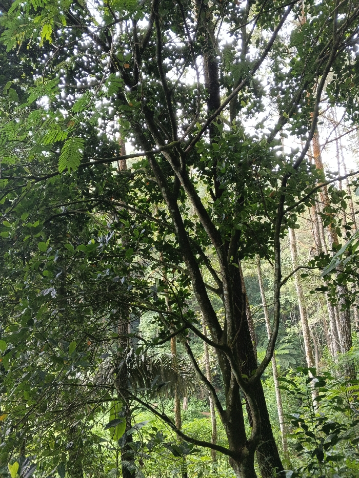 A dense forest scene is dominated by verdant trees and lush vegetation. Sunlight filters through the thick canopy, creating bright spots. A prominent tree with a dark trunk and winding branches covered in moss stands centrally. Numerous trees with tall, straight trunks fill the background. Ferns and various green plants grow densely near the forest floor.