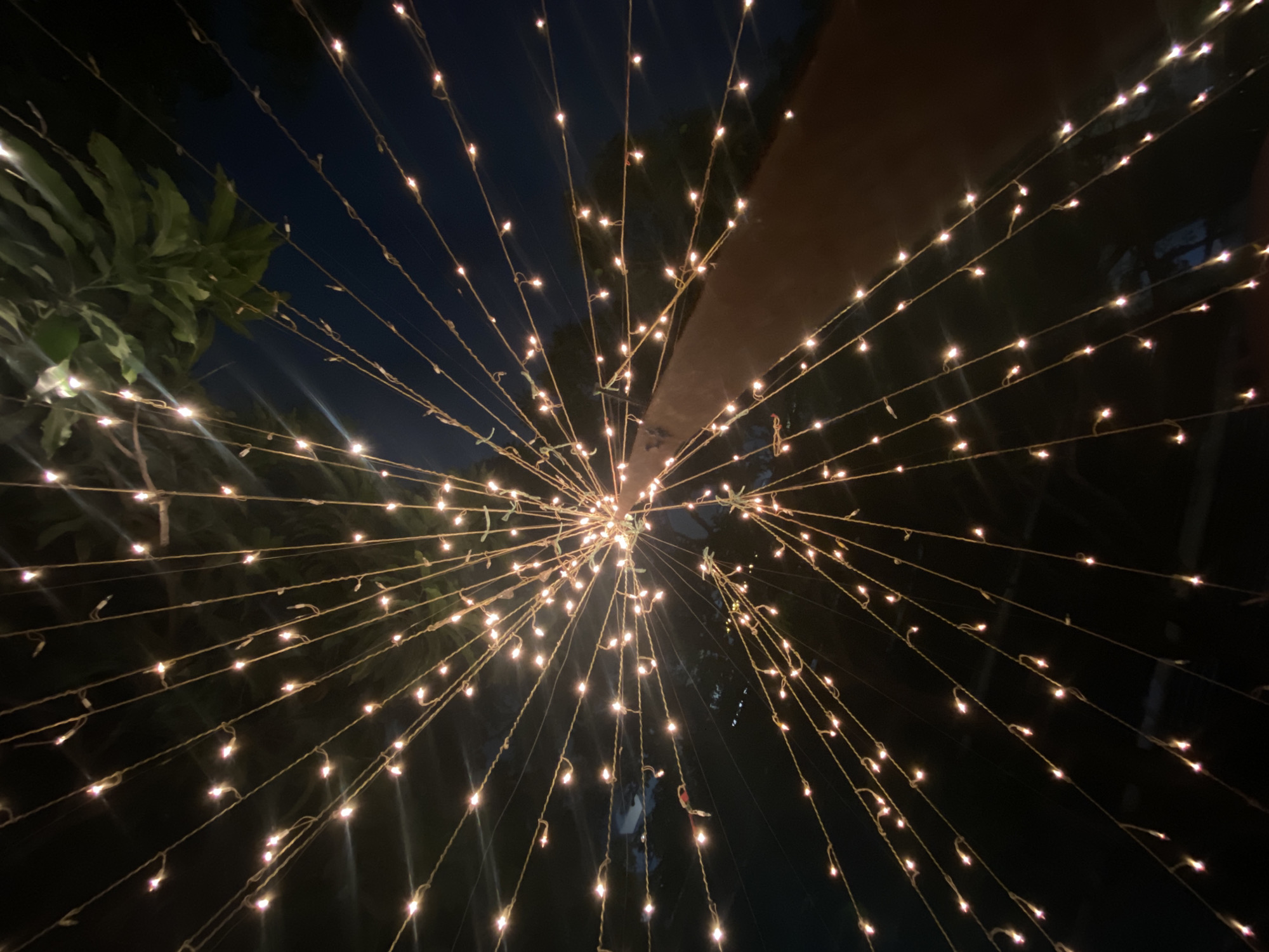 At night in Dhaka, Bangladesh, strings of lights radiate outward from a central point. The light strings, studded with small bulbs, create a starburst pattern against the dark sky. Trees are visible at the periphery, and a building looms in the background.