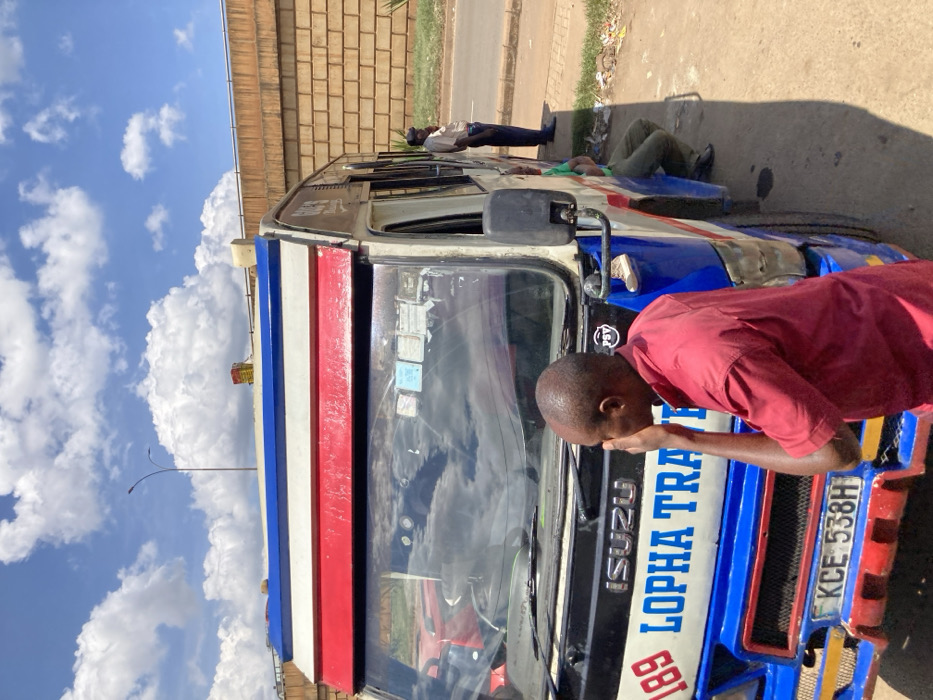 The image depicts a street scene in Kalimoni ward, Kenya, under a bright blue sky with prominent white cumulus clouds. A white Isuzu matatu (public service vehicle) with prominent blue and red horizontal stripes along its roofline and lower body occupies the central and left portions of the frame. The matatu's front features "ISUZU" branding, the number "189", and "LOPHA TRAVEL" in blue text. Its license plate, "KCE 538H", is clearly visible on the lower bumper. A small, light-colored shoe ornament hangs near the driver's side mirror, and a "PSV" sticker is present on the windshield. In the immediate foreground, a bald, dark-skinned male wearing a red short-sleeved collared shirt stands facing right, with his right hand covering his mouth or lower face. His posture suggests a pause in speech or a reaction. Partially obscured behind the matatu's side, a second male is visible from the waist down, wearing a green shirt and dark trousers, appearing to be seated. Further back, near the matatu's rear, a third dark-skinned male stands upright on a paved shoulder, dressed in a light-colored shirt and dark trousers. The background features a significant light-brown brick or stone retaining wall or bridge structure. Beyond this structure, a paved road is visible, bordered by green foliage. The foreground ground consists of dirt and scattered debris. A streetlight pole is discernible against the sky in the upper mid-ground. The scene is illuminated by strong daylight, casting clear shadows.