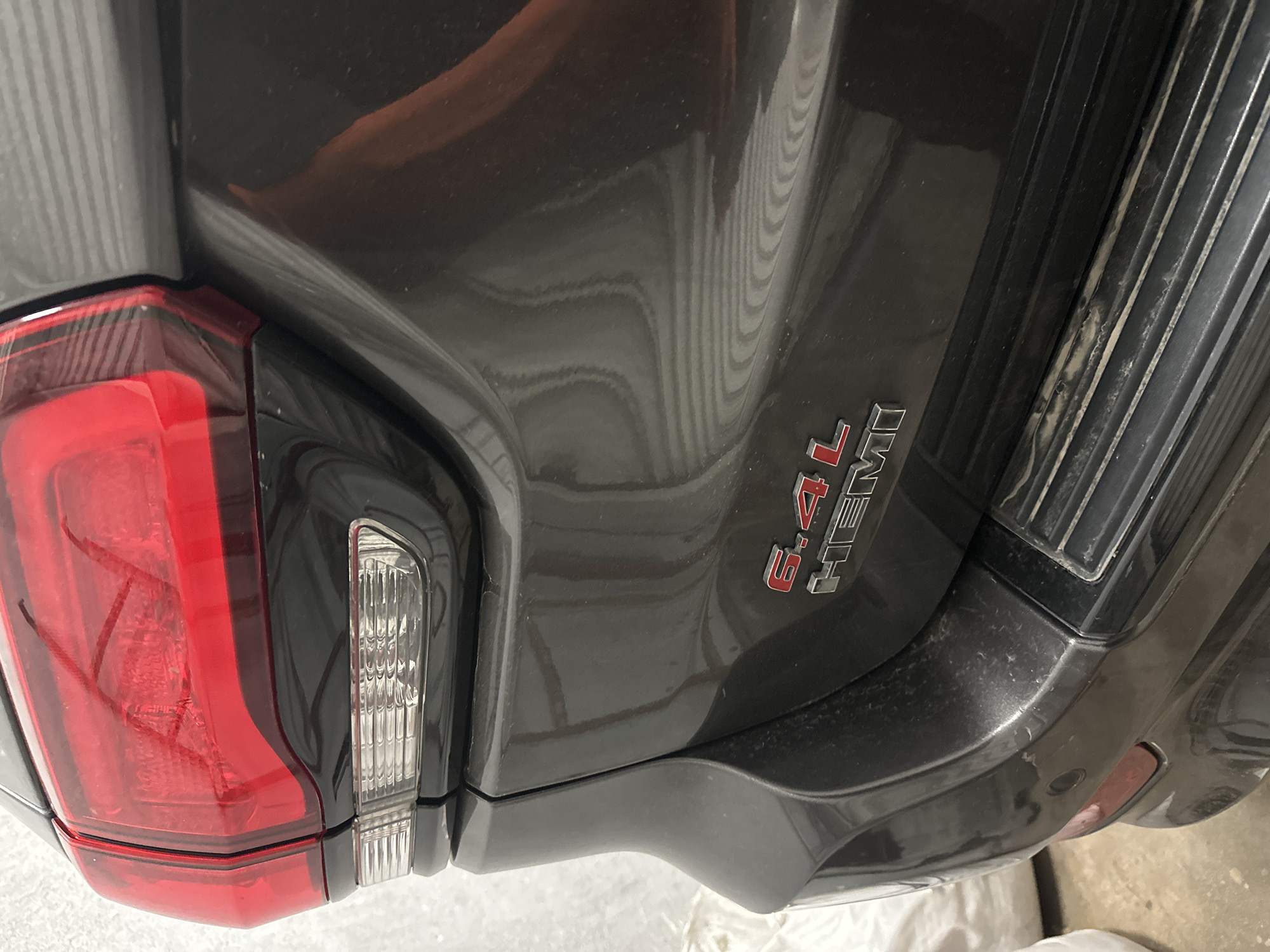 The rear passenger-side quarter of a dark grey sport utility vehicle (SUV) is observed in an indoor setting, likely a garage, in Rakovski, Bulgaria. The upper left quadrant features a red taillight assembly with a clear lower reverse light section. Emblems displaying "6.4L" in red and "HEMI" in chrome with red accents are affixed to the body panel below the taillight. The vehicle's surface exhibits a layer of dust and reflections of overhead structures, suggestive of lighting, along with an indeterminate orange shape. A dark, textured plastic bumper with accumulated dust constitutes the lower portion of the vehicle. The immediate environment includes a light-colored fabric object on the left and a concrete floor. No individuals or active interactions are present in the frame.