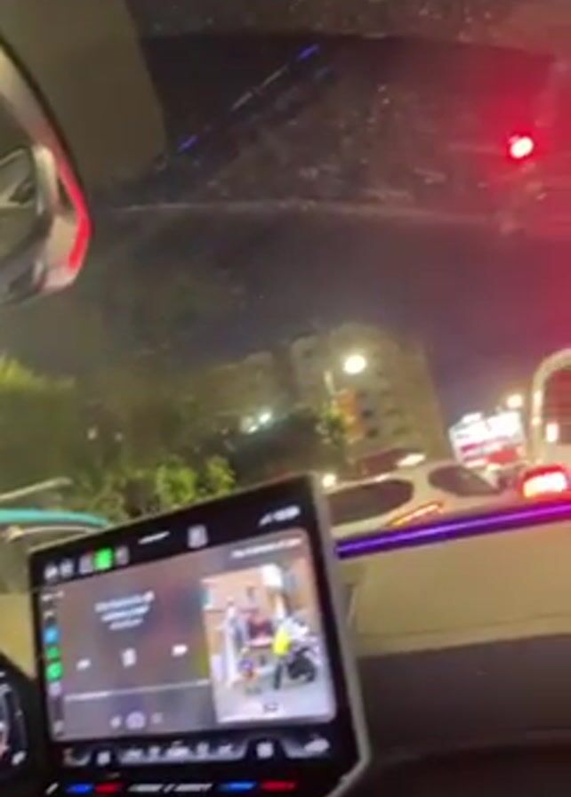 The camera is inside a car in city traffic at night. The car's infotainment screen shows a music player. The car ahead is a white Jeep with purple underlighting. Traffic lights turn from red to green. A tall minaret is visible between buildings. The windshield is somewhat dirty.